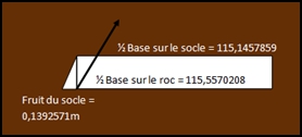 Il existe en plus ce que l’on nomme « le fruit » du socle de 0,1392571 m (référence au diamètre du soleil). La ½ base théorique « sur le roc » complète = 115,5570208 m + 0,1392571 = 115,6962778 m.
